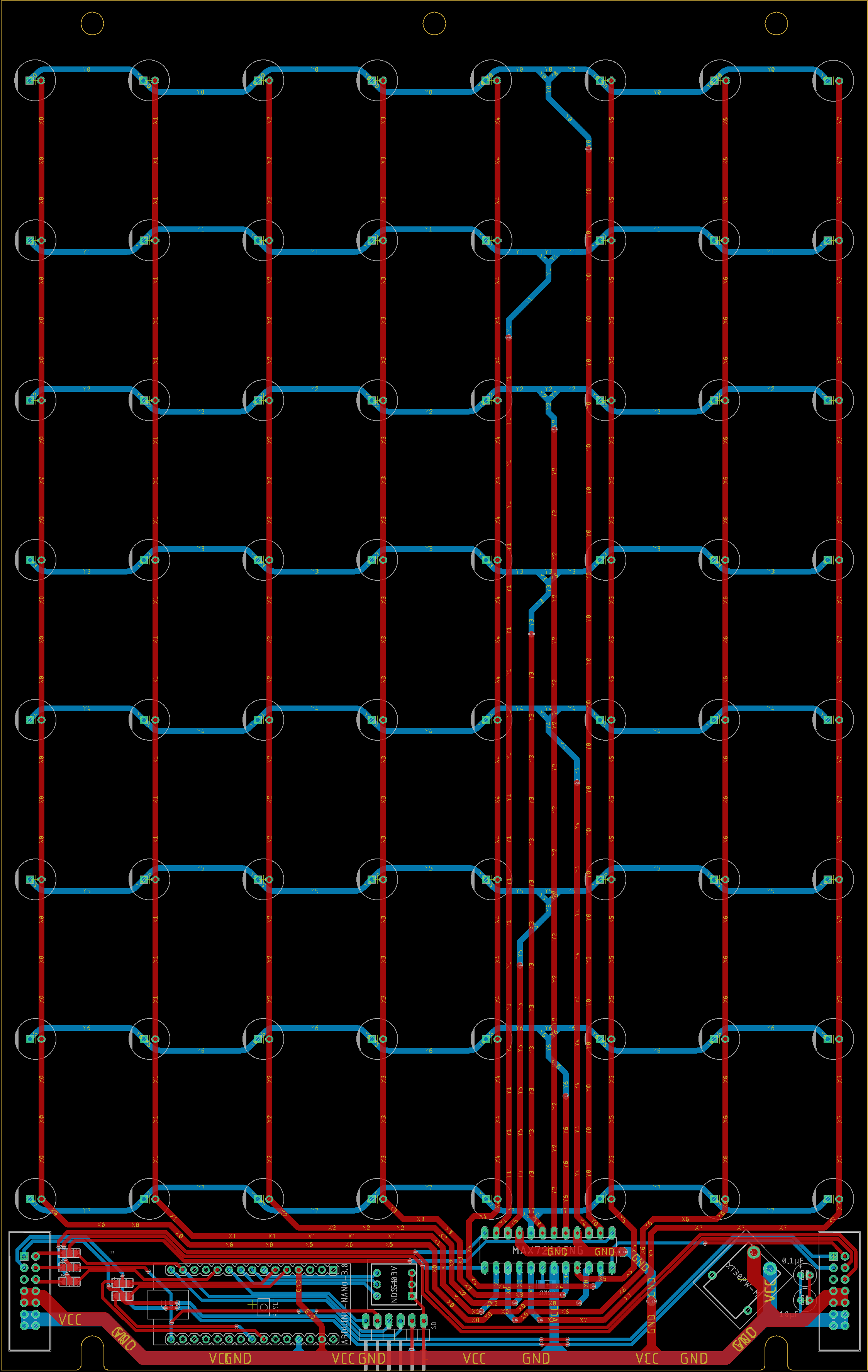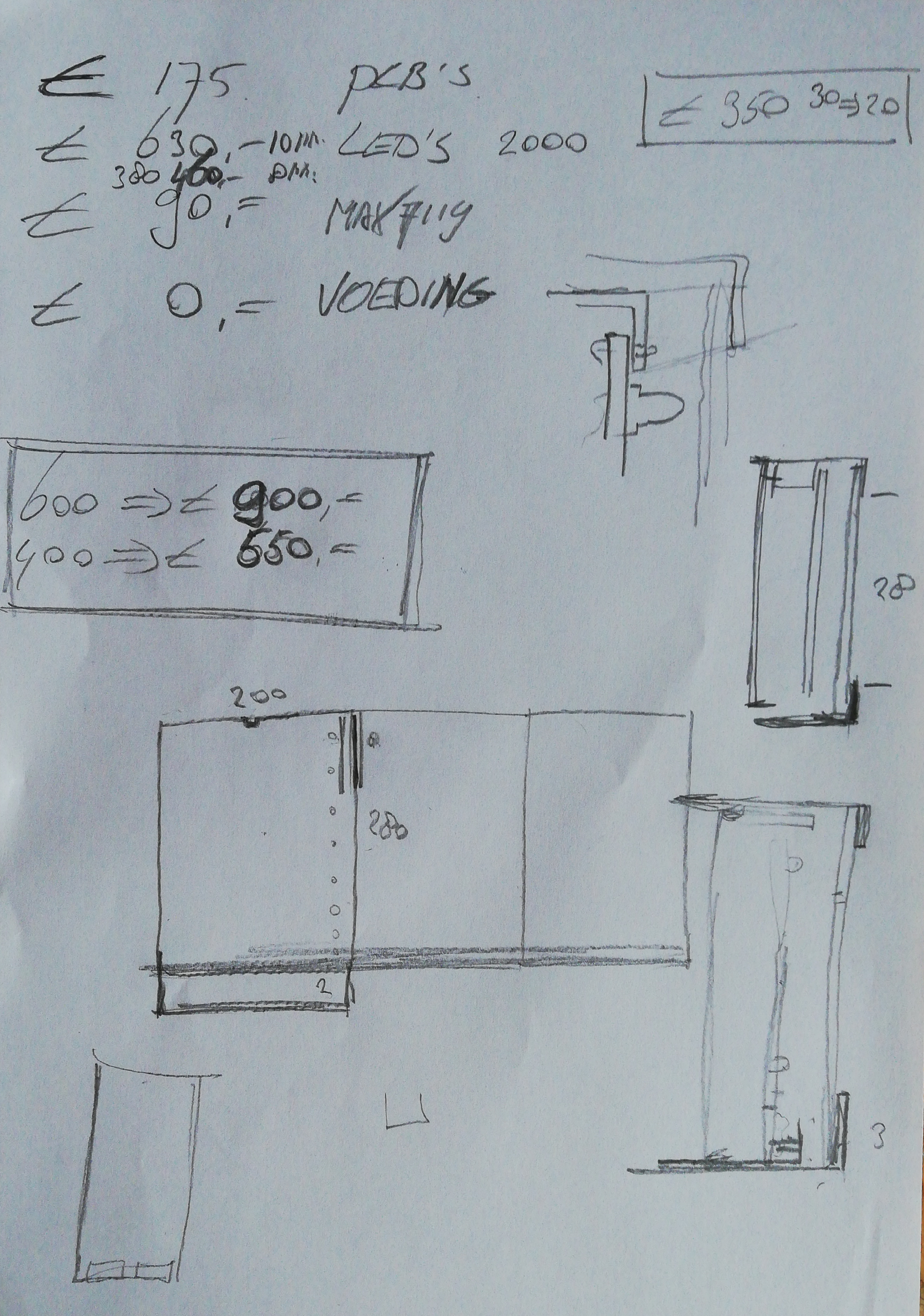 After this I started designing PCB's. They had to include the Arduino, the MAX7219, the LED's of course, and last but not least a way to split the display up in sections. We weren't sure if the signal would reach the last display, as now we knew the led spacing, we knew the total display length would be around 6 meters.